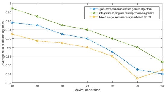 To verify the effectiveness of the proposed algorithm, it is compared with the existing mixed-integer nonlinear program based software defined task offloading algorithm [47] and Lyapunov optimization-based genetic algorithm [31]. The results of the comparison are displayed in Figure 7. Lyapunov optimization-based genetic algorithm and mixed integer nonlinear program based software defined task offloading algorithm are NP-hard programs, whereas the integer programming solution is NP-complete [44]. Lyapunov optimization-based algorithm and the proposed algorithm are dynamic, but results show that proposed algorithm is taking average less energy concerning each device. The X-axis shows the number of maximum distance between every Mobile device and servers, whereas Y-axis displays the average ratio of offloading tasks. Each energy level starts from and gradually decreases to . This graph depicts the variation in the level of offloading tasks to distance. When the distance increases, the average ratio of offloading tasks starts decreasing. If the distance between the MEC server and a mobile device is increased, then the channel power also amplifies, this increment in channel power requires more energy and results in the execution delay.