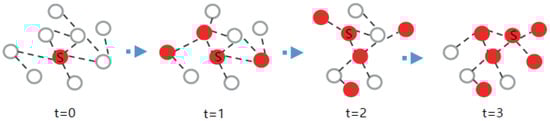 As the information spreading model, we consider a well-known Independent Cascade (IC) model for both information spreadings where the description is as follows. In this model, nodes have three possible states, susceptible (S), active (A) and inactive (I). At the susceptible state, a node is allowed to be activated. An active state is the one which is activated at the previous time slot, being able to activate other susceptible child nodes, while an inactive state denotes a state which is once activated earlier, but unable to activate other susceptible nodes anymore. The activated nodes are active for only one time slot, and they become inactive at the next time slot. Once a node becomes inactive, it maintains the state until the end of the cascade process. More precisely, if a node i received one information (we call this by “Infection”) at time t from one of its infected nodes, it tries to spread its own information to its neighbor j with probability at the next time . Under the above network model, we assume that the diffusion occurs after the connection is made between two nodes at time t. In other words, if the connection is generated at time t, the node who has the information tries to spread to other nodes using the connected edge at the same time t. (This can be interpreted by introducing an arbitrary small number such that the diffusion is performed after ) Further, if there is no connection from a node i to j at time , the node i does not try to spread the information to node j any more. This assumption makes sense for the case that the power of information of spread decays as the time goes on [24], so the diffusion does not happen later even when the connection is generated. We denote by the information source, which acts as a node that initiates diffusion and denote of infected nodes and the observed snapshot at time t. Further, we denote by the infection subgraph, which is consists of infected nodes and edges at time t.