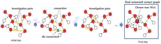 - Investigate whether each connection e is true (i.e., contacted) or not on . If it is true, insert a connection set and otherwise, remove the connection. Set ;