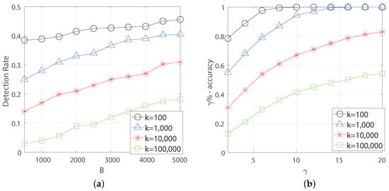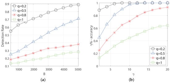 Detection rate and %-accuracy of DNSE(k) for various dynamic parameter (we set the flipping parameter and diffusion parameter , respectively.) (a) Detection rate vs. Budget B. (b) %-accuracy.