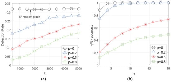 In Figure 4, we obtain the detection performance for various flipping probability For the simulation, we set the dynamic parameter and diffusion parameter . In Figure 4a, we obtain the detection probability for by increasing the budget of investigation If , there is no change of connections in the network regardless of the dynamic parameter k. Hence, it remains as an ER random graph, which is initially generated. In this case, we see that the detection probability is about 0.32 regardless of the budget B due to using the source estimator , which was designed for ER random graph in [14]. As increasing the overall detection performance degraded due to frequent changes in current connections. However, we see that if we use the investigation budget up to 5000, the detection probability also increases up to 0.2 even for by reconstruction of the contact graph. In Figure 4b, we also obtain the %-accuracy. We also check that for the cases the source is at least in the top 10% with probability 0.99 among the infected nodes whereas it is included in top 10% with probability 0.38 for Finally, we obtain the detection probabilities for various estimation algorithm as described in the earlier subsection in Table 3 by increasing We use the dynamic parameter and investigation budget and we see that our proposed algorithm DNSE(k) also outperforms to others.
