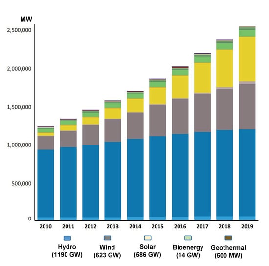 - IRENA. Renewable Capacity Highlights. 31 March 2020. Available online: https://www.irena.org/Statistics/View-Data-by-Topic/Capacity-and-Generation/Statistics-Time-Series (accessed on 12 May 2020).