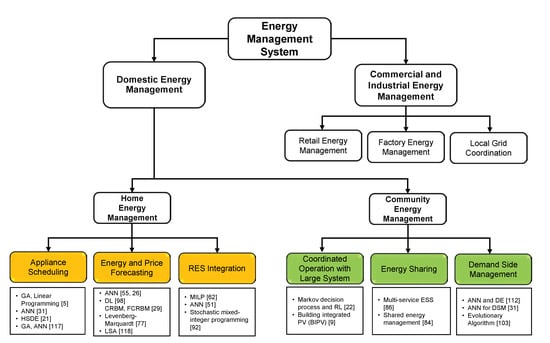 Due to the availability of enough customer data, computing resources, and potential training algorithms, AI has now matured enough to forecast the electricity price even in the complex environment to the customer. A comparative analysis of such intelligent schemes has been investigated in this research focusing on deep learning (DL) and support vector regression (SVR). DR is the change in electricity consumption pattern by end-users from their usual pattern according to the price of electricity over the time proposed by the utility, or to get financial incentives to compromise the power system reliability due to peak demand []. In SG, the demand prediction helps to decide on how much-generating units to be utilized efficiently so that the burden could be shared optimally to improve the reliability of the generators. Recently, many researchers have focused on leveraging AI techniques for energy demand prediction [,]. Lu et al. [] propose an hour-ahead DR algorithm using reinforcement learning and ANN to overcome the uncertainty in future electricity prices, considering the user comfort and consumption behavior. In the presence of consumers and utility data, AI techniques can be utilized to model the load and demand prediction [], as demand and supply prediction helps make many other decisions in SG. The types of energy management system in the smart grid with enabling techniques reviewed in this paper is shown in Figure 3.