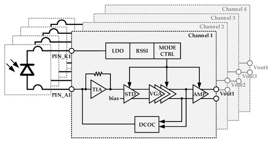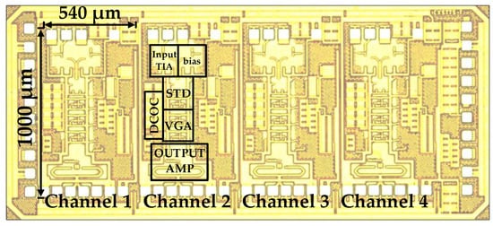 The DCOC loop is implemented to eliminate the output DC offset due to process variation []. Additionally, the RSSI module is applied to control the adjusting resistors in the VGA, which changes the photodiode’s DC current provided by the LDO on the chip. Furthermore, adjustment of the output swing, gain, and bandwidth is realized by controlling the current sources of the STD, the VGA, and the output amplifier via the power mode controller. The four lanes share only one bandgap module on the chip in order to minimize the chip area.