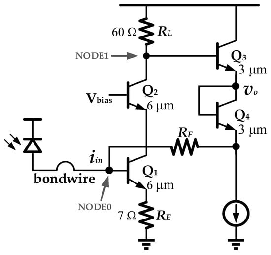 An ideal TIA must satisfy the requirements of low noise, high gain, relatively wide bandwidth, and small deterministic jitter. Hence, there is an inevitable trade-off [] among them, and a circuit model is helpful to optimize the TIA. Considering the time constants of the nodes in the TIA feedback loop, the input pole (NODE0) of the TIA and the output pole (NODE1) of common emitter (CE) stage Q1 with emitter degeneration dominate the bode plot of the TIA feedback system. Meanwhile, the capacitance at the input node of the optical receiver has the largest value among all the nodes, which provides the largest time constant and leads to the dominant pole. Thus, the small-signal equivalent circuit of the input TIA can be simplified into a second-order system, which is shown in Figure 3.