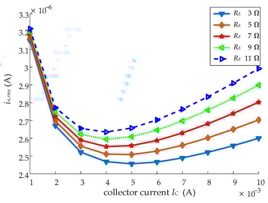 Considering that the performance of the bipolar transistor varies a lot with the DC operating point in SiGe BiCMOS technology, Q1 with given size has to be biased at the optimum operating point for high Ft (characteristic frequency) and β (common emitter current gain). Therefore, the size of Q1 can be determined by a given IC. Then, the sizes of Q1, Cb, and gm are proportional to IC [], and Rb is inversely proportional to the sizes of Q1 and IC. Hence, IC determines the values of rb, gm, and CT with given CEX. The improved noise optimization method modifies the noise model (Equation (5)) and gets the relationships among IC, rb, gm, and CT; then the optimum IC can be obtained from given RF, RE, and CEX.