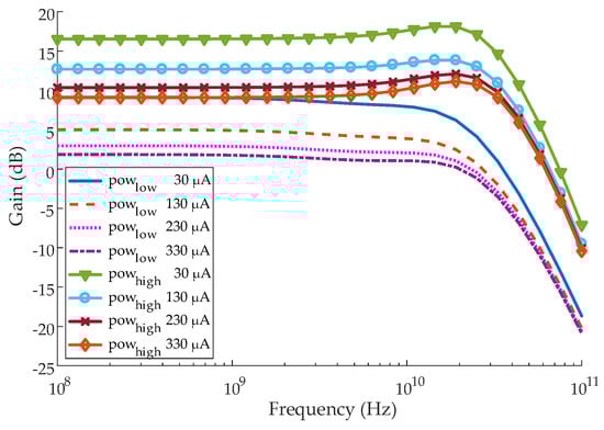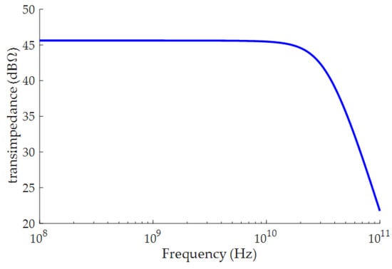 As a rule of thumb, the value of CEX is 100 fF. As given by Equation (5), the noise is also suppressed by large RF. However, large RF would degrade the bandwidth of the TIA from Equation (3) and S11. As a result of a trade-off, RF was selected to be 230 Ω. Although the noise and crosstalk coupled from the ground wire are suppressed by emitter degeneration, the noise introduced by emitter degeneration resistor RE increases the input-referred noise current of the input TIA stage. Therefore, the value of RE has to be small enough that it will not deteriorate the input-referred noise. The results of the noise optimization method by Matlab with RE varying from 3 Ω to 11 Ω are shown in Figure 4. Considering the requirement of ξ, RE was selected to be 7 Ω from Figure 5. Then, the optimum collector current is 4 mA, and the corresponding emitter length of Q1 is 6 μm. The value of AV was derived from the given RF and CT from Equation (3) for the bandwidth requirement. As shown in Figure 6, the simulated BW of Figure 2 is 29 GHz. Meanwhile, the simulated in,rms of Figure 2 is 2.6 μA, which confirms the accuracy of the noise model in Equation (5) and the improved noise optimization method. With the stability of the TIA enhanced by emitter degeneration, the simulated damping factor ξ (Equation (2)) is 0.74, which is stable enough for PVT variation.