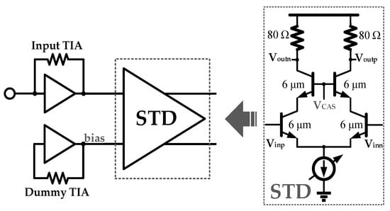 The current signal from the photodiode is a unipolar non-return-to-zero (NRZ) single-ended signal. Compared with a single-ended signal, a differential signal offers superiority [] that makes it the optimal choice for signal processing. The STD stage following the input TIA stage transforms the single-end signal to a differential signal. The STD stage block diagram is shown in Figure 7.