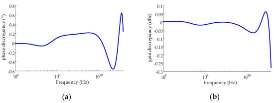 A common differential amplifier with cascode structure and a variable current source comprises the STD stage. The variable current source controlled by the power mode equips the STD stage with variable gain. The differential inputs of the STD stage are the output of the input TIA stage and a DC bias generated by a dummy TIA. Meanwhile, the bias is set equal to the output DC component of the TIA stage. Then, the phase and amplitude discrepancy in differential signals can be minimized with this structure. As shown in Figure 8a,b, the simulated gain and phase discrepancy of the optical receiver are smaller than 0.05 dBc and 0.4° within the bandwidth of interest, respectively, which provides good matching performance.