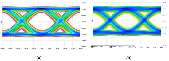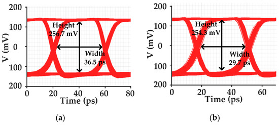 The measured eye diagrams with a 300 μApp input signal (for PRBS7) are presented in Figure 19a,b, where the receiver works in high-power mode. The measured results of the eye diagrams in Figure 19a,b are given in Table 1. The eye heights with input signals at 25 Gb/s and 28.9 Gb/s are 154.2 mV and 114.8 mV, respectively. The eye diagram at 25 Gb/s has a much larger eye height than the eye diagram at 28.9 Gb/s. The crossing of the eye diagram become larger with higher data rates, as shown in Table 1. Additionally, the measured BER of the optical receiver with a 200 μApp input signal varying from 25 Gb/s to 28.9 Gb/s (for PRBS7) is 10−12 when the receiver works in both high-power mode and low-power mode.