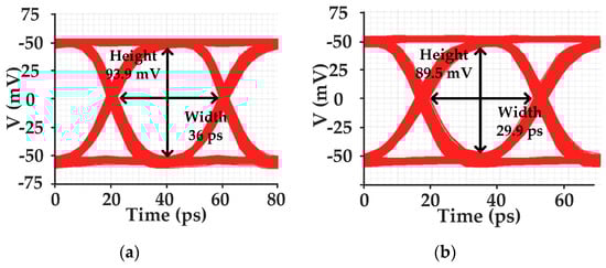 A schematic of the output amplifier is shown in Figure 11. The bandwidth of the output stage is limited by unavoidable large parasitic capacitance. An inductor is used in the output stage to compensate the effect of this parasitic capacitance. The inductance in series with a resistor creates zero peaking for bandwidth extension. The adjusting current source is programmable for variable output swing. In order to get a much cleaner eye diagram with high eye height, the current source was set with large output current in the high-power mode. The simulated 25 Gb/s and 28.9 Gb/s eye diagrams of the optical receiver in high-power mode are shown in Figure 12a,b, and the simulated 25 Gb/s and 28.9 Gb/s eye diagrams of the optical receiver in high-power mode are shown in Figure 13a,b. The simulated eye heights in high-power mode and low-power mode are 255 mV and 90 mV, respectively. The eye height also decreases with higher data rates.