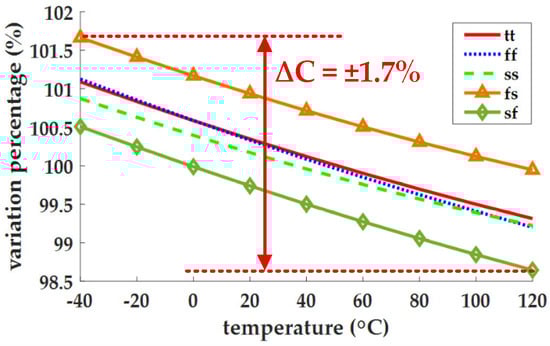 The simulated process and temperature variation of the total parasitic capacitance.