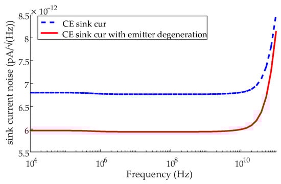 where vn,sink_cur denotes the input-referred noise voltage of the sink current source. Compared with the sink current of the CE stage, the emitter degeneration term gm5RE5 equips the proposed sink current source (Isink) with noise suppression in Equation (8). The simulated input-referred noise current introduced by the 100 μA sink current source of a CE stage or a CE stage with emitter degeneration is given in Figure 17. in,in_sink_cur decreases by 0.82 pA/√(Hz) due to emitter degeneration.