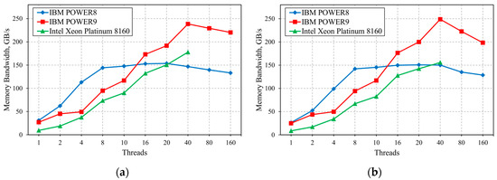 STREAM benchmark calculations were performed with a different number of computational threads that were uniformly distributed over sockets (half of overall threads number on each). ST (Single Thread, one thread per core) mode was used for the IBM POWER8 processor for a case when the number of threads did not exceed 20. When the number of threads equals to 40, 80, and 160, the SMT2, SMT4, and SMT8 modes (two, four, and eight threads per core) were used, respectively. IBM POWER9 and Intel Xeon Platinum 8160 processors have more cores, so ST mode was used for them when the number of threads did not exceed 40. SMT2 and SMT4 modes were used for 80 and 160 threads, respectively.