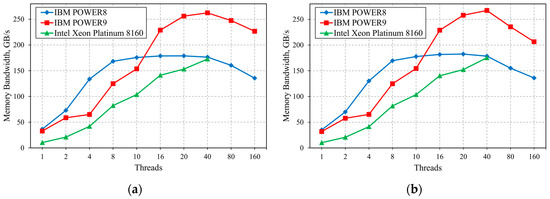 Analysis of the obtained data shows that the biggest bandwidth improvement for IBM POWER8 processors is achieved with a sequential increase in the number of threads up to the number of available memory channels. A further increase in the number of threads up to the number of available cores leads to a bandwidth increase of 6–7.5%. On the other hand, the increase of bandwidth for IBM POWER9 and Intel Xeon Platinum 8160 is relatively uniform when computational cores are sequentially added in ST mode. All considered systems demonstrate a decrease in memory bandwidth in SMT mode, due to a growing number of cache conflicts.