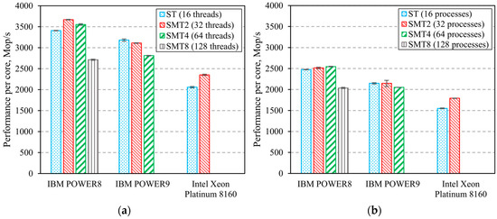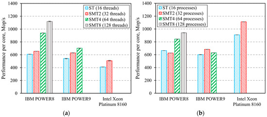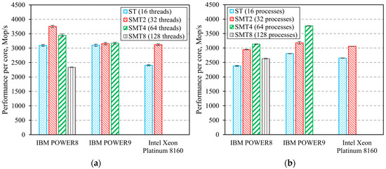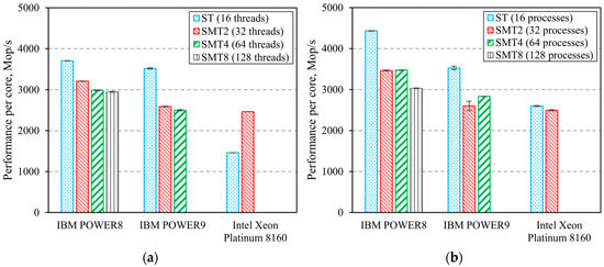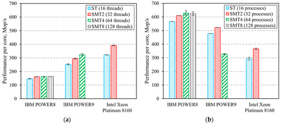 MG benchmark uses a multi-grid algorithm to find an approximate solution of a 3D Poisson equation with periodic boundary conditions. It features structured long-distance data communication [14]. Figure 5 shows the results of the experiments. They prove that SMT does not lead to a performance boost for any of the POWER CPUs. However, SMT does boost Intel Xeon Platinum 8160′s performance in the OpenMP implementation by 69%.