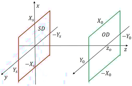 Consider a magnetic current of bounded finite planar support ( stands for source domain) located at whose radiated field is observed over another planar domain (i.e., the observation domain) located in near-field at . The source is assumed to be directed in the plane whereas only the tangential components of the radiated field are collected. Under this framework, the problem can be split into two scalar problems that can be addressed in the same way. Therefore, here we only consider the current directed along the x-axis, i.e., , and collect the corresponding tangential y-component of the radiated field (see Figure 1 for a pictorial view of the configuration).