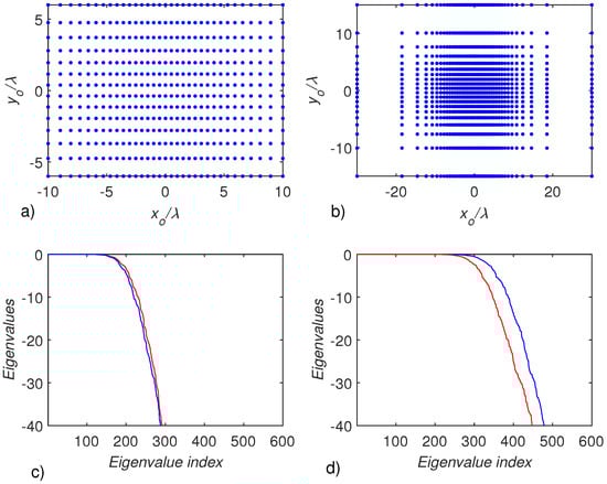 We consider a source domain (with and ) and assume to collect the data over two measurement domains both located at : the first one is (with and ); the second one is (with and ). The corresponding results are reported in Figure 2. In particular, in panels (a) and (b) the sampling point distributions returned by the proposed non-uniform sampling scheme are sketched for the two considered observation domains. Panels (c) and (d) instead report the comparison between the eigenvalues of and . According to the theoretical derivation, we have a strict constraint on the size of the measurement aperture which should not exceed the one of the source. Nonetheless, in both the cases considered in Figure 2, the observation domain violates such a constraint, especially for the example reported in panels (b) and (d). By looking at such a figure the following conclusions can be drawn. First, the proposed sampling scheme is able to very well approximate the eigenvalues even when the observation domain slightly exceeds the source domain (see panel (c) which refers to ). Instead, in panel (d), where is much larger than , it is evident that the number of degrees of freedom is underestimated since the ‘knee’ of the eigenvalues starts before the actual one. This means that the sampling points are not enough (and not properly located). However, the initial part of the eigenvalue behavior is very well-approximated. Hence, we conclude that in this case, the proposed non-uniform sampling strategy is able to approximate only a subset of all possible radiated fields, i.e., the ones spanned by the singular functions corresponding to the singular values that are well-estimated. As a consequence, it is expected that the non-uniform sampling can allow for a good radiated field approximation if the field significantly projects on those singular functions, even when the constraint on the size of is not strictly verified.
