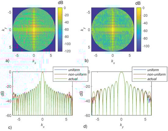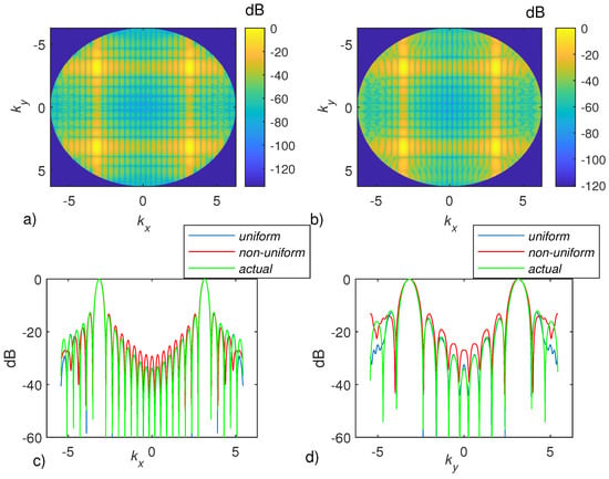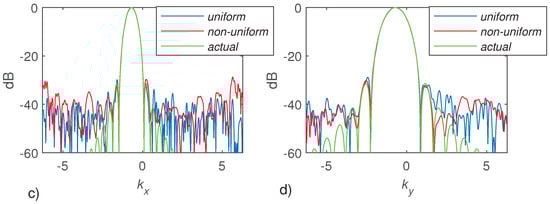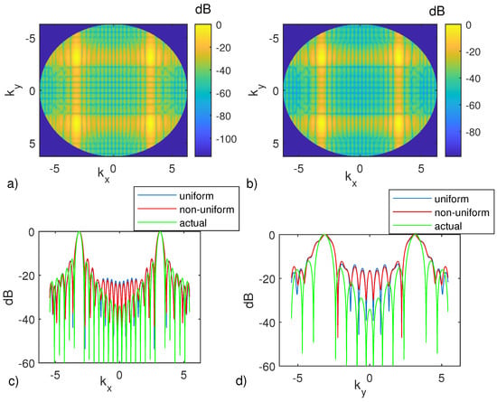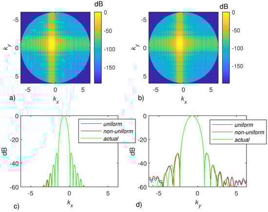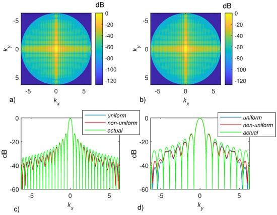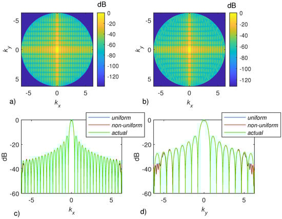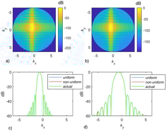 The radiation pattern corresponding to is reported in Figure 3 and Figure 4 for the measurement aperture and , respectively. For example, by comparing panels (a) and (b) of Figure 3 the radiation patterns computed by using the proposed method and the usual uniform sampling look very similar. This can be even better appreciated by looking at the cut-views shown in panels (c) and (d), where the blue lines refer to the radiation pattern computed by using the uniform sampling and the red ones to the radiation pattern obtained by the proposed method. In particular, herein, the actual radiation pattern (in green lines) is also reported for comparison purposes. Since for this case, the non-uniform sampling succeeds in approximating well the near-field (see Table 1) this very good match between the radiation patterns computed by using the two sampling schemes under comparison was indeed expected. In particular, they also exhibit a similar truncation error in the very low side-lobe region along (see panel (d)). This, of course, is because the observation domain is shorter along y axis. However, this error is dramatically reduced in Figure 4 where the larger measurement aperture was considered. In fact, since in this case, the aperture has been enlarged and the radiated field still projects well on the singular functions that have been well-approximated through the non-uniform sampling, the three lines overlap very well and appear indistinguishable.