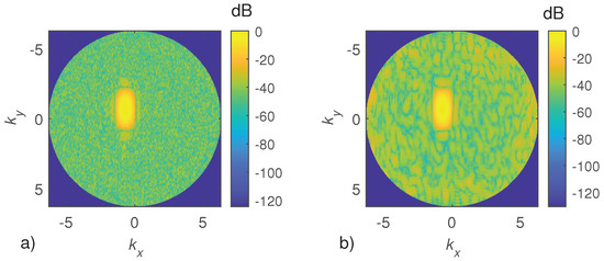 We now pass to analyzing the radiation patterns which are obtained by Fourier transforming (by means of a FFT procedure) the near-field data. The radiation patterns are reported as a function of the spectral variables and , with and being the usual polar angles, and shown only for the so-called ’visible’ domain, that is for . More in detail, after collecting the field data according to the proposed non-uniform sampling scheme, the field is interpolated over a uniform grid and finally, Fourier transformed.