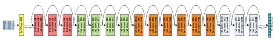 The basic concept is to use “identity shortcut connections” by skipping the blocks of convolutional layers. These basic blocks are called “bottleneck” blocks which follow two heuristics as follows: (i) for the feature map having the same output size, the depth of filter map remains the same; (ii) if the size of the output feature map is halved, then, the depth of the filter map is doubled. The convolutional layers perform downsampling directly with a stride of 2; between each convolution and ReLU activation function, a batch normalization is processed. On the one hand, for the same dimensions of input and output, identity shortcut is used. On the other hand, for unequal dimensions, the linear projection shortcut is used to insert 1 × 1 convolutions and match the dimensions. In both these cases, when the identity shortcuts exceed the size of two feature maps, they are implemented by a stride of 2. The architecture ends at the fully connected layer having 1000 neurons activated by Softmax function. These 1000 neurons indicate the 1000 classes of ImageNet challenge [].