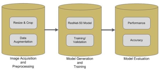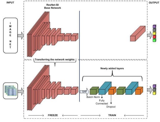He et al., in 2016 [], were the first to introduce the concept of the residual network (ResNet). The main advantage of ResNet is that it solves the problem of vanishing gradient and degrading accuracy by introducing a concept of shortcut connections making it flexible, task-dependent, and capable of training extremely deep neural networks. These shortcut connections are allowed to skip one or more subsequent layers. The pretrained ResNet-50 model is shown in Figure 1.
