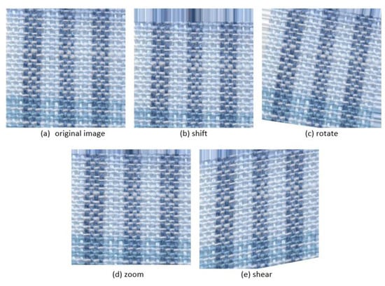 In this study, we applied several augmentation techniques on the images such as horizontal and vertical flips, shifting, rotation (images are rotated at fixed angles of 30° starting from 0°, 30°, 60°, 90°, and so on), zooming, shearing, and brightness manipulation. An illustration of these augmented images is shown in Figure 5. It was important to rotate the images in order to identify the warp and weft yarns that were oriented in different directions due to the variations that occurred during the image acquisition. Zooming clearly identified the interlacing pattern of woven fabrics. Shearing created the local deformation in the images. All these augmentation techniques related to the situations occurring in the real scenario.