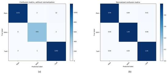 Confusion matrix for plain, satin, and twill weave fabrics. (a) Confusion matrix, without normalization; (b) Normalized confusion matrix.