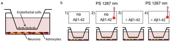 Schematic illustration of a three-cell model of a neurovascular unit (NVU)in vitro: (a) the cultivation and differentiation of cells of NVU: the formation of a monolayer of astrocytes occurs in 7–9 days; for neurons, in 10–14 days; and for endotheliocytes, in 7 days; (b) the experimental groups: (1) the control group, no Aβ 1–42 and PS; (2) photostimulation (PS) without application of Aβ 1–42; (3) application of Aβ 1–42 without PS; (4) Aβ 1–42 + PS.