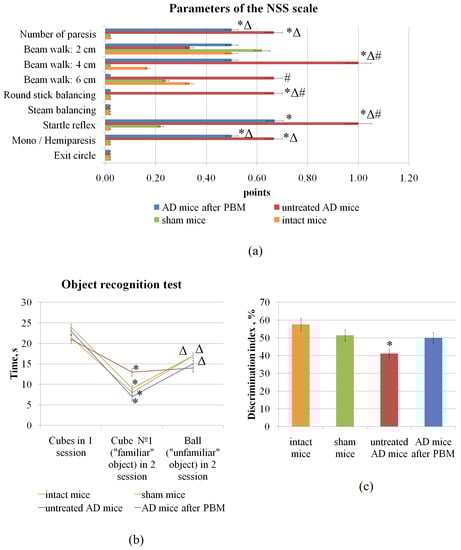 The PS effects on the memory and neurological status of mice with Alzheimer’s disease (AD): (a) The assessment of the neurobehavioral status of mice on the NSS scale (*—p < 0.05 vs. intact mice; Δ—p < 0.05 vs. sham mice; #—between untreated AD mice and AD mice received PS); (b) The object recognition test, reflecting the processes of learning, recognition and memorization (*—p < 0.05 vs. cubes in 1 session; Δ—p < 0.05 vs. cube Nº1 («familiar» object) in 2 session); (c) The discrimination index by the object recognition test (*—p < 0.05 vs. sham mice). n = 10 for each group.
