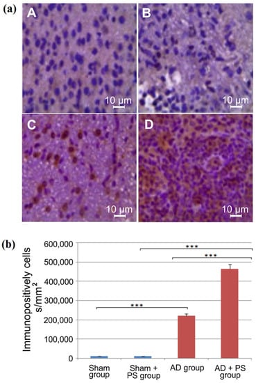 ICH analysis of Aβ plaques in the deep cervical lymph nodes (dcLNs) before and after PS: (a) A and B—ICH image does not show Aβ plaques in the dcLN in the sham groups; C and D—ICH image shows few Aβ plaques in the AD group and a significant Aβ level in the AD + PS group (n = 10 in each group); (b) The quantitative study of Aβ level in the dc LNs in the tested groups: ***—p < 0.001 vs. the sham groups, n = 10 in each group.