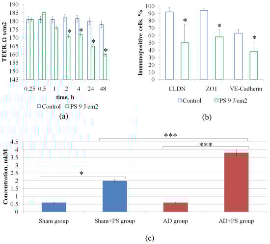 The PS-mediated effects on the blood-brain barrier (BBB) permeability: (a,b) The changes in transendothelial electrical resistance (TEER) and in the expression of tight junction (TJ) proteins before and after PS in normal mice, respectively; (c) The quantitative analysis of PS effects on the BBB permeability for fluorescent Aβ; *—p < 0.05; ***—p < 0.001 vs. the sham groups, n = 15 for (a,b); n = 10 for (c).
