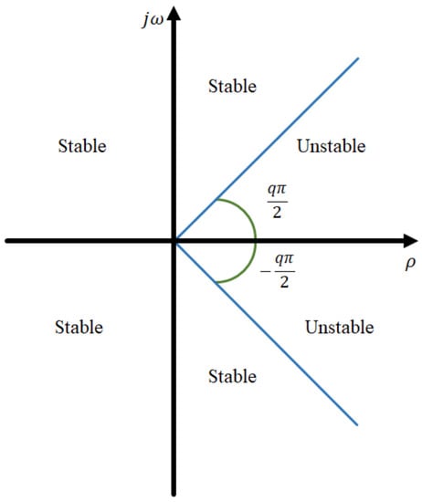 In contrast with integer-order systems, the local stability in fractional-order systems depends on the derivative order (q), and creates a whole region of stability shown in Figure 1 [28]. Its worth to mention that the stability of an equilibrium point can be controlled employing a fractional-order modification. Considering a general k-dimensional fractional-order system as the described in Equation (3), with eigenvalues, it is possible to define the stability of the system through its eigenvalues analysis and classify it. Consider the system defined by: