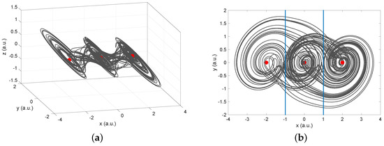 Dynamical behavior for Equation (4) with Equation (5), solved for an integer-order. The system presents a Maximum Lyapunov Exponente (MLE), MLE = 0.4347. (a) Projection on the plane, and (b) in the plane. Attractor generated for . The Equilibrium Points (EP) are depicted in red. The switching surfaces (commutation surfaces) correspond to the vertical blue lines (SW) in (b).