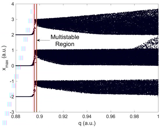 The fractional-order system described in Equation (4), is analyzed for a fixed control parameter , associated with the nonlinear function described by Equation (5), an integration size , where the integration order will be the same in the three-state variables. A bifurcation diagram of fractional-order vs local maximum in the x state variable is calculated (Figure 3), where it is possible to observe qualitative changes in the system dynamics, region delimited by red solid lines. Such changes in the temporal series boost to develop a more detailed study in the system behavior, where the multistable phenomenon is present, which will be described in the following section.