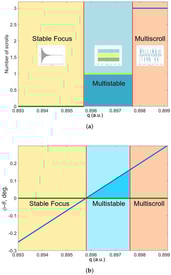 To better understand the state transitions in the system, the angle difference between the critic integration order () and each of the integration orders analyzed is measured and shown in Figure 4b. This means that for an integer order corresponds an angle ( for ), and the critical integration order has a constant angle of (as defined in the third case of the fixed points stability in fractional-order systems, Section 2.1), being the difference plotted as a diagonal blue line in Figure 4b. In Figure 4b, it is also possible to see that the multistable region exists for , which corresponds to an integration-order range of values . As in Figure 4a, the color areas indicate the different possible states that the system can present by using fractional-order. In both figures, the abscissa axis represents the different integration orders analyzed. The associated results for are omitted for better visualization since there is no other state transition in that value range.