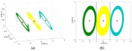 The basin of attraction displayed in Figure 8 validates that the system presents the coexistence of three single-scroll attractors. The location of each possible state is defined by the commutation law, where each attractor surrounds its equilibrium point. In comparison, the multistable states present a decree in their amplitudes. It is worth to remark that, according to the fractional calculus theory, the multistable dynamic has only been achieved by employing the modification in the local stability of each equilibrium point, where the eigenvalues of the system remain without any change.