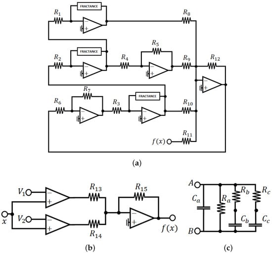The electronic implementation of the system described by Equation (4), is based on the properties of analogous calculus [13], implemented through operational amplifiers. The electronic circuit that resembles a fractional-order capacitor, is called fractance. The circuit shown in Figure 6a corresponds to the linear operator of the analyzed model. The implemented nonlinear function (), corresponds to a PWL function based on operational amplifiers, also called a Saturated Non-Lineal Function (SNLF), for the generation of a 3-scrolls attractor, as reported in [42], shown in Figure 6b.