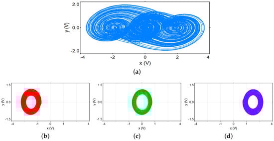 In order to prove the multistable behavior, described in former sections, an analogical simulation is developed, where the system described by Equation (4) is analyzed with the use of a nonlinear function of three levels, with an integration order in each state variable. The results, shown in Figure 7, validates the theory previously developed. The integer-order dynamics is obtained by substituting the fractances by 10 nF capacitors, and changing for 10 k resistors.