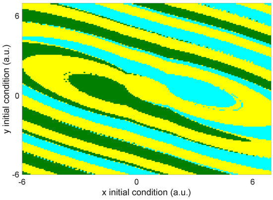 From the attractors shown in Figure 5, it is possible to say that the system presents a multistable behavior for specific initial conditions. To validate that the system presents a multistable behavior, the associated basin of attraction is calculated with the integration order , the same value used in Figure 5. The colors in the basin of attraction (Figure 8) correspond to the attractor colors of Figure 5.