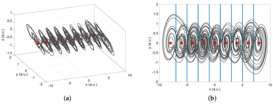 Dynamical behavior for Equation (4) with a 9-level PWL, solved for an integer-order. The system presents a Maximum Lyapunov Exponent (MLE), MLE = 0.3953. (a) Projection on the plane, and (b) in the plane. Attractor generated for . The Equilibrium Points (EP) are depicted in red. The switching surfaces (commutation surfaces) correspond to the vertical blue lines (SW).