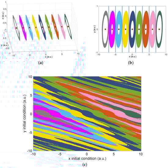 Additionally, it is possible to extend this result to any number of stable final states by the addition of domains to commutation law, Equation (5). To validate this, consider the generation of an attractor with 9-scrolls as the one shown in Figure 9a, with value . The integer-order dynamics generate a 9-scroll attractor with eight switching surfaces, where each equilibrium point corresponds to the center of each scroll. Since the linear operator is the same one as described in Equation (4), the stability analysis indicates a critical integration order . When the system shown in Figure 9 is analyzed for an integration order , the emerge of 9-multistable states is arise, displayed in Figure 10a,b, where each possible state corresponds to each of the domains in the system. Notice that, also, in this case, the center of each scroll is the same equilibrium point, where the location of them has not been changed. The corresponding basin of attraction is calculated, and depicted, in Figure 10c, where the colors in the basin are related to the colors in the corresponding attractors shown in Figure 10a,b.