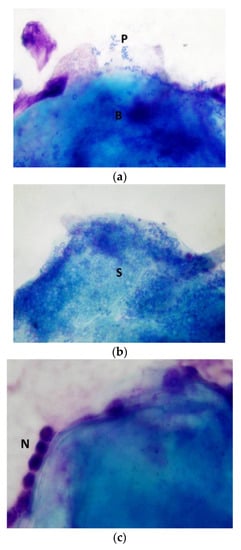 (a) Nasal cytology: Bacterial biofilm. Characteristic is the cyan color of the biofilm. Numerous bacteria within the exopolysaccharide matrix (B); and informs planktonic (P). (May Grunwald Giemsa (MGG); 1000× magnification); (b) nasal cytology: mycotic biofilm. Numerous mycotic spores (S) within the exopolysaccharide matrix. (MGG; 1000× magnification); (c) nasal cytology: biofilm. The exopolysaccharide matrix of the biofilm represents a true barrier to neutrophils (N).