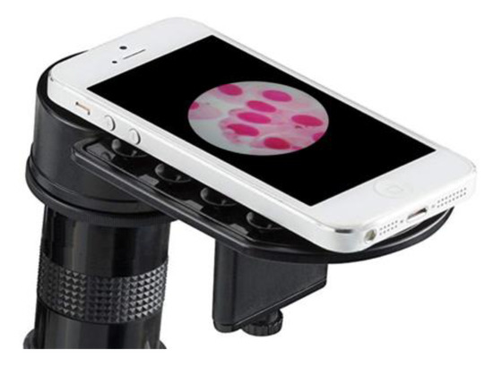 The first one takes advantage of the evolution of the smartphone technology and is based on the development of RhinoSmart [47], a multimedia system able to acquire an image from the digital microscope and to extract the cellular elements. During the preliminary technical trials, the images of the smears have been acquired with a Samsung Galaxy S6 Edge smartphone with a 16-megapixel digital rear camera, with a photo resolution of 5312 × 2988 pixels and an aperture of F/1.9. A specific smartphone adapter was also used as in Figure 2.