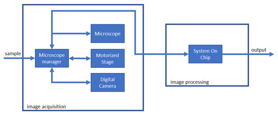Block diagram of the second scenario described, which comprises a motorized microscope for the “image acquisition” and a system on chip board to perform “image processing”.