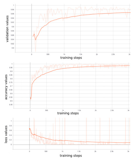 - The training phase, in which the convolution of the images via the network is carried out, updating the weights of the latter step by step. The update of the weights, through back propagation, takes place in 70 epochs. The choice of the number of epochs derives from a careful analysis of the accuracy, validation and loss function graphs in relation to the number of epochs. The graphs relating to the different trends during the training show a substantial slowdown in convergence over the twenty-fifth epoch (step 1000). While, in correspondence with the seventieth epoch (corresponding to step 2750), the value relating to accuracy, validation and loss function converge, see Figure 4. Moreover, it should be clarified that the CNN has been trained using back propagation and value of learning rate has been set equal to 0.001;