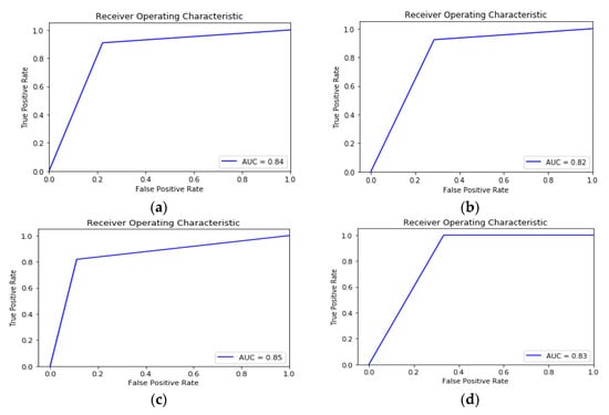 The system we designed has been tested according to the four configurations described above. For each configuration, training time of approximately 35 min was required. During the training phase, cross validation was used, using 80% of the tiles to train the system and 20% for the test. Figure 5 shows the results obtained considering each configuration. The results are related to the accuracy of the system and the precision, recall and f1-score of the predictions of each class on the test set. In addition, the receiver operating characteristic (ROC) curve and the relative area under curve (AUC) are calculated by plotting the true positive rate against the false positive rate.