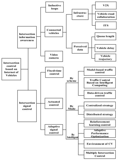 Current adaptive control methods, such as MBC, intelligent computing methods and data-driven methods, can only be applied to small-scale and linear control systems. In the current era of the Internet of Everything, there must be new control methods to break through this limitation. The current vehicle–intersection control network, based on documentation of the last 10 years, can be divided into the following categories: intersection data-driven RL control, with performance optimization based on adaptive control of the intersection and automated vehicles; and network-linked automotive environment intersection control, based on the main road and network control of the connected vehicle and autonomous vehicle environment [68,76]. Table 2 summarizes the analysis of the main technical characteristics of the traditional adaptive control methods, and the current adaptive signal control research’s hotspot direction.