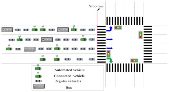 Regular vehicles (RV), connected vehicles (CV) and automated vehicles (AV) compose traffic flow, which changes the urban road network traffic composition. In addition to private cars, there will be busses in the traffic, which makes the traffic streams more complicated, as shown in Figure 3. The information network of connected vehicles and automated vehicles affects driving behavior and demand. The study of a multi-modal traffic flow control theory is imminent [23]. Adaptive flow control is used to meet the needs of real-time traffic. The adaptive traffic control system with V2X conditions is superior to the fixed loop detector under normal traffic conditions. It will provide more detailed information, including vehicle location, speed, queue length, stopping time and other information, which means it attracts more attention from scholars.