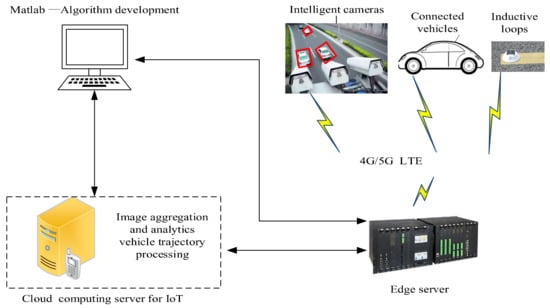 Today, it is not uncommon for transportation infrastructure and vehicles to have the ability to network and provide useful information. The rapid development of the Internet of Things has greatly improved the framework [32]. Many researchers have focused their research on the use of the Internet of Things in ITS, as well as traffic information collection and dissemination, and traffic flow management and monitoring [33]. Figure 4 shows an implementation of 4G/5G communication technology in connecting intelligent cameras, loop and connected vehicles to the Internet of Things. Intelligent cameras, connected vehicles and loops sense the state, and communicate these messages to the 4G/5G communication technology. The features are processed through the cloud server, and finally the information perception and prediction are performed through the algorithm of the Matlab platform.